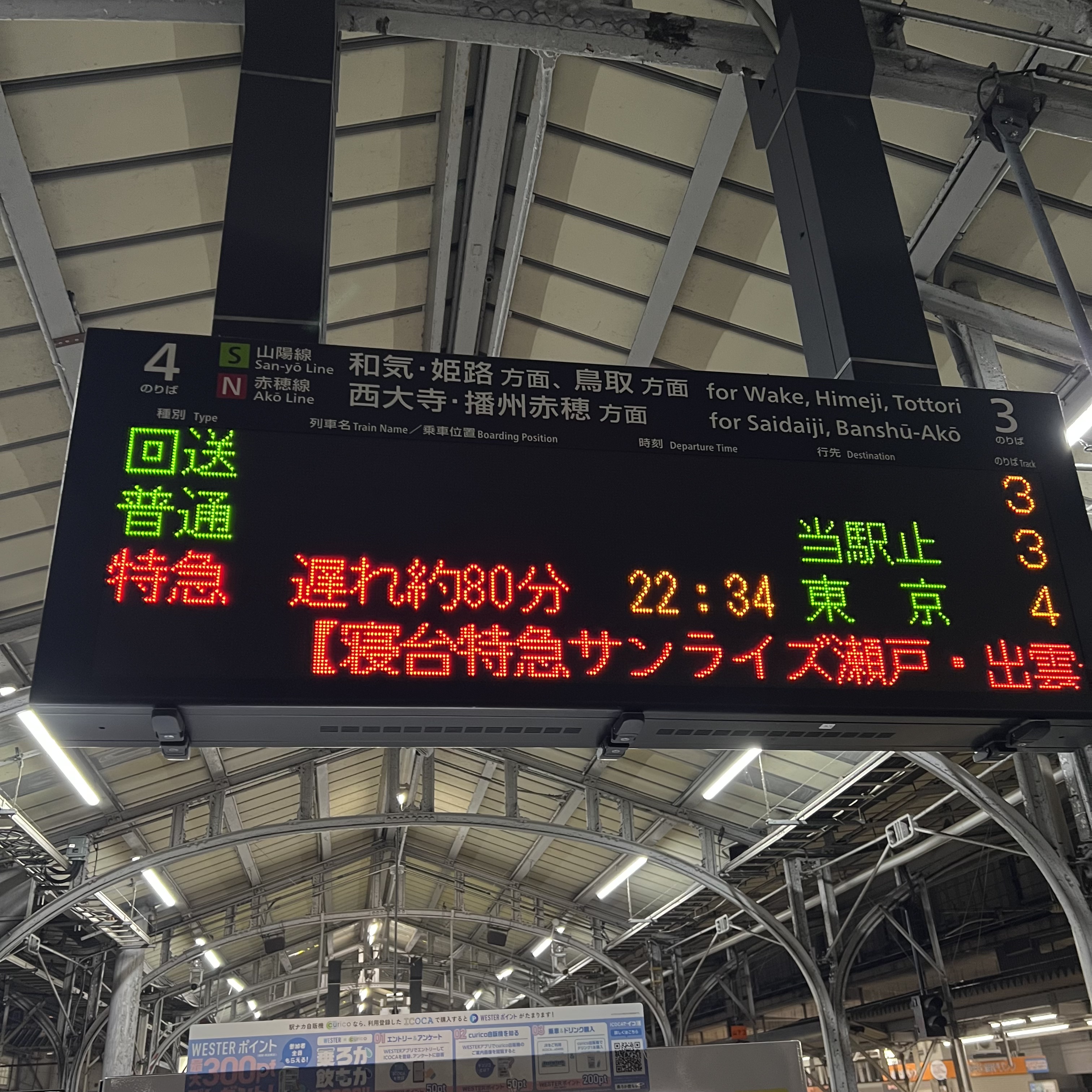 サンライズ瀬戸・出雲は80分遅れ.