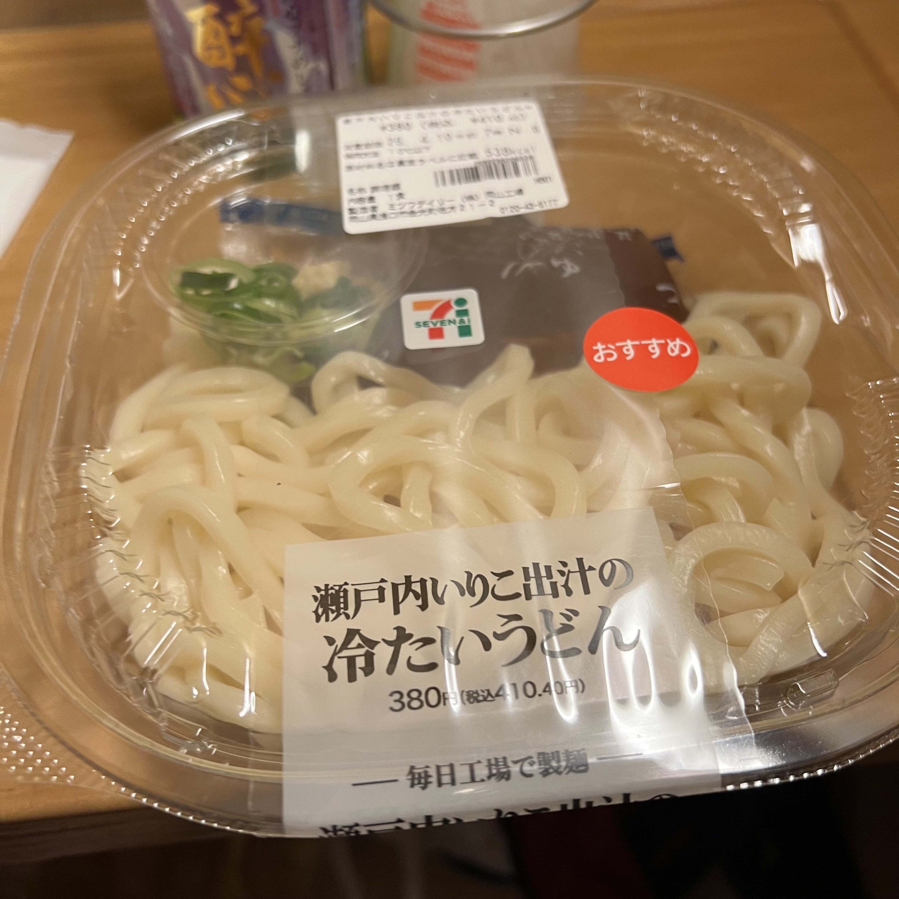 今回はセブンイレブンで買った「瀬戸内入りこ出汁の冷たいうどん」を購入.発車が遅れたのでお腹空いてきた.買っておいて正解だった.