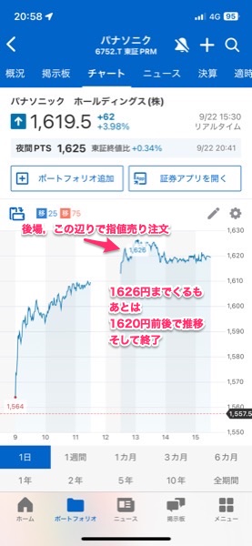 1624円前後を刻んで上下していたけど,1630円で指値で入れてみた.日経平均も一時700円も上げて46000円も見えてくる感じだったので,1630円くらいになるかと思って強気で行ってみた.