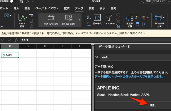 セルにティッカーコードのAAPLを入力して[株式 (English)]ボタンを押す.