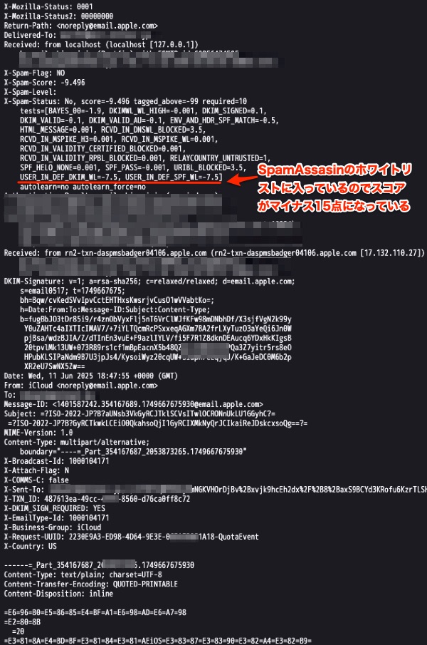 以前facebookのログインメールを調べた時と同じで,WLはSpamAssasinのホワイトリストに入っている.