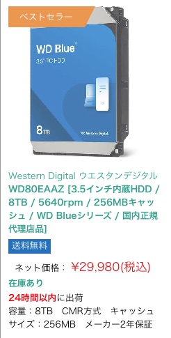 ウエスタンデジタルで日本円で2.5万円程度.ちょうどストレージの価格と同等.