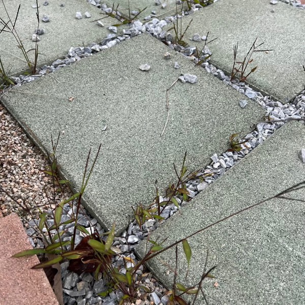 土の上にダイソーの防草シートを引いているので,根が深く入ってないのですぐ抜けるけど,土があれば生えるらしい.防草砂利が薄いところに生えている感じか.