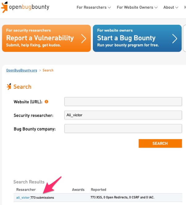openbugbounty.orgのサイトでリサーチャーを調べると,Ali_victorという人は居たようだけど,現在は取り上げられ散るのかな.審議中か?