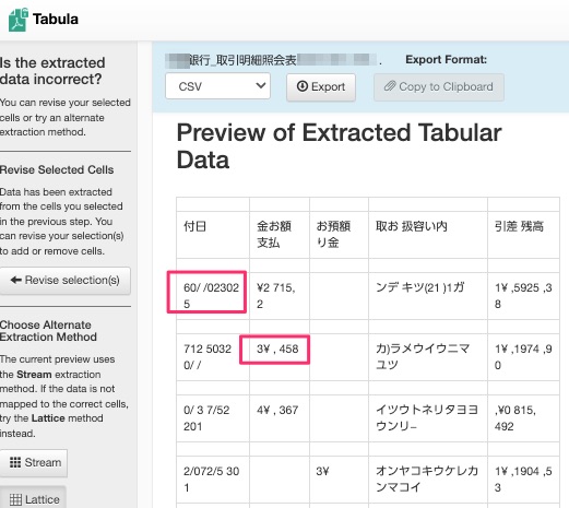 数字や日付の列は安定して取り出せるので、通帳の「日付・金額・残高」などは比較的きれいにCSV化できます。