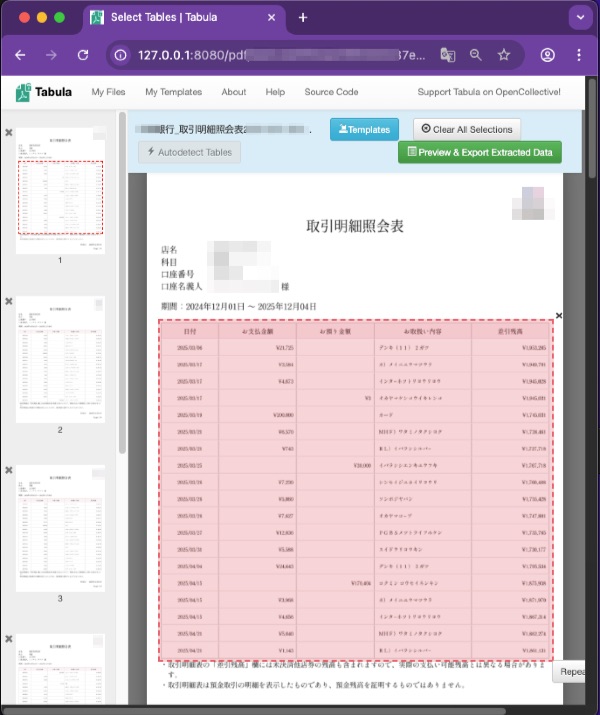 テキスト型PDF(銀行通帳や明細が「文字」として埋め込まれているタイプ)なら、日本語でも問題なく抽出できます。