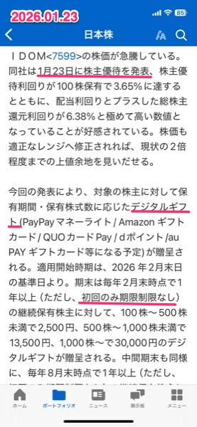 中古車のガリバーを運営するIDOMが,株主優待を導入のニュースがあった.