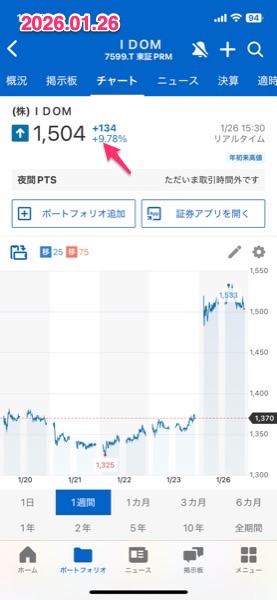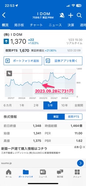 ビッグモーターが株式売却していて知ったIDOMだけど,自動車生活評論家の女性の偽リーク記事で暴落したとか,損保ジャパンの関連か,金融庁が立入検査に入ったとか,いろいろあったけど大きな不祥事は出ないで,この時が来たという感じ.