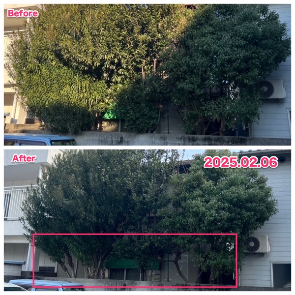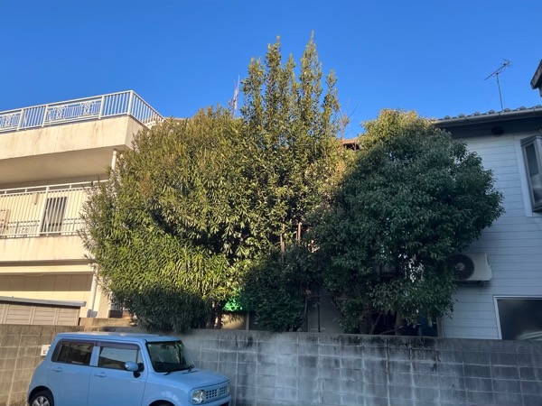 家の裏に回って外から写真を撮ってみたけど,全然減っている感じがない.したの方がスッキリしただけなんだが,これは家の裏が駐車場になっていて,社用車っぽくて土日も車が動いてくれないので,切った枝で車体を傷つけないように考慮した結果.