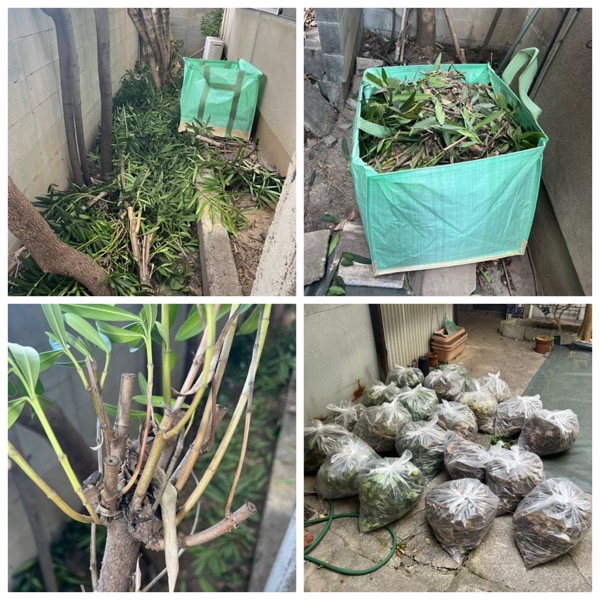 今回は250リットルくらい入るガーデンバッグを買って剪定した葉っぱや枝を集約.ゴミ袋に入れて捨てることを考え,20cm程度に刻んで19袋とガーデンバッグ1個分の剪定を正味8時間くらいかけて行いました.