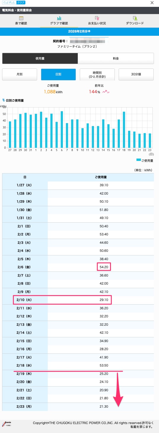 修理してから2週間程度経ったけど,月が変わったので中国電力の「ぐっとずっと。クラブ」にログインして電力量を確認.
