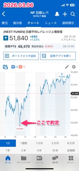 日経平均の2倍の動きをするという,「NEXT FUNDS日経平均レバレッジ上場投信」,証券コード1570.日経平均が上がるとわかっている時に買うと,2倍の値動きなので資金効率が良いとされるので,以前,買ってみようとしたら,押し目待ち(下がる)だったので約定できなかったのが2月で54000円だった.