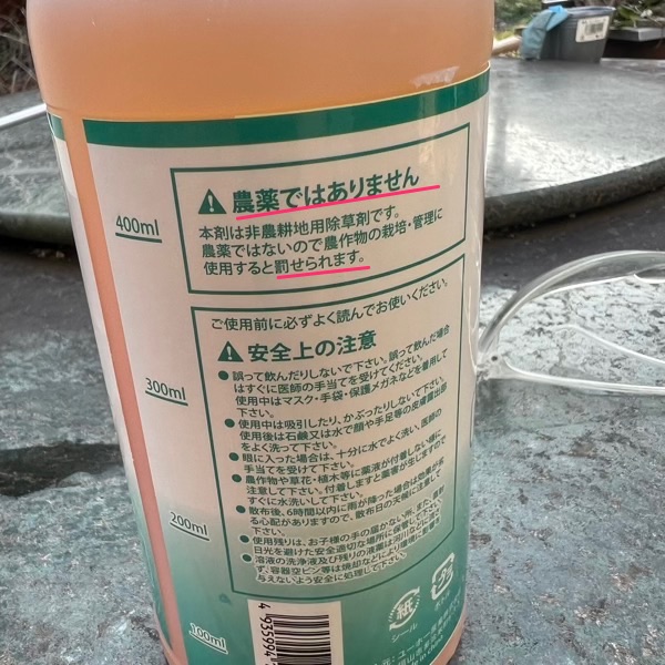 過去に除草剤は,ネット情報で評判の良かったビッグモーター御用達の日産化学のラウンドアップと同じ成分のものを勝手に生えている謎の木を切って枯れるように農薬を注入してみたで買ったサンフーロンがまだ残っているけど,確認すると500mlでAmazonで1,458円だったので,今回の除草剤は約3分の1の価格.