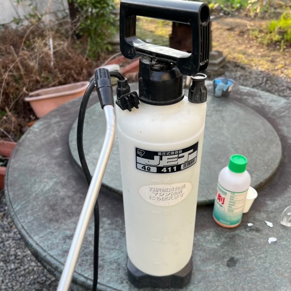 噴霧器.手動式でタイヤの空気入れのようにレバーを上下させて圧縮させます.今回は水4リットルに,80mlくらいの原液を入れて薄めてみました.