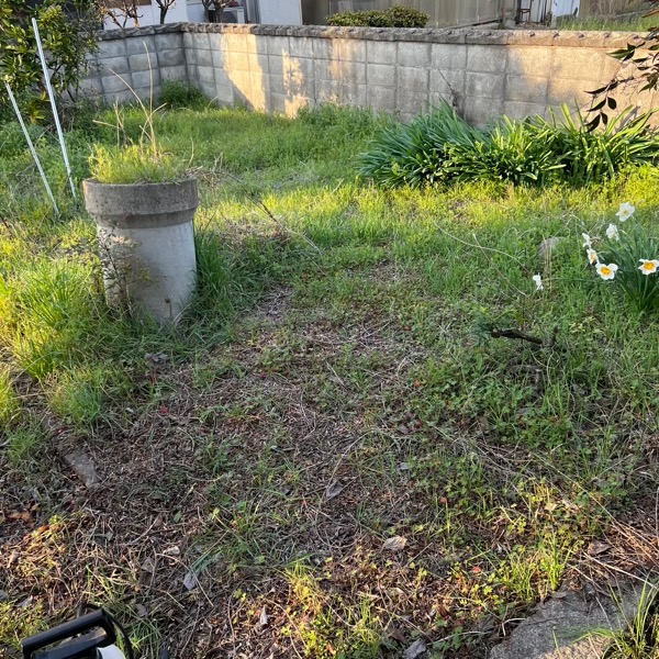 今回ターゲットとなる噴霧前の状態.草刈りしといたんだけど,やっぱり春になってきたら草が生えてきてる.スイセンの花もあるけど,オカン曰くこれも勝手に生えているそう.スイセンにはかけないようにしながら丁寧に噴霧.