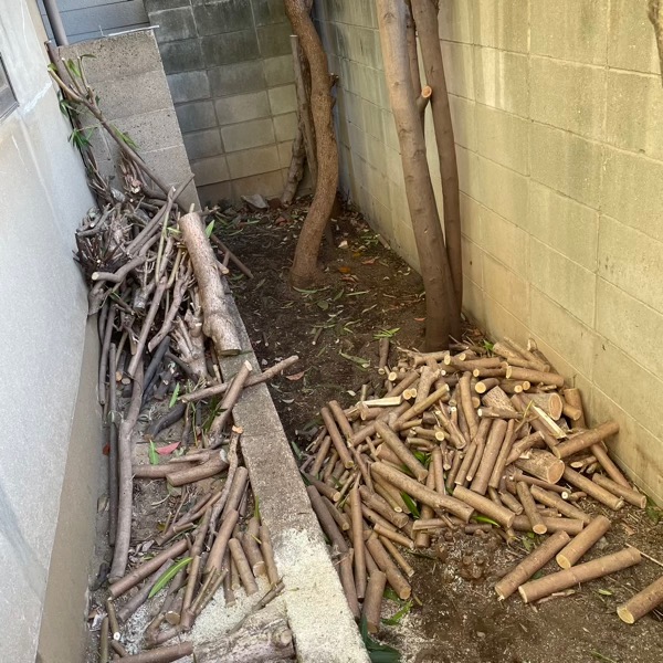 葉っぱや2cm以下の枝を取り除いたら3cmから10cmくらいの枝が残るので,黙々とレシプロソーで切断.