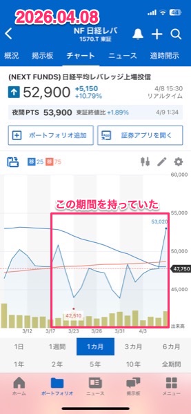 日経平均レバレッジ上場投信 1570 48200円で再入場したのが3月17日.