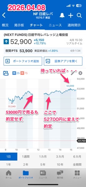前場のギリギリで売りを入れたけど,約定しなかったので13時ごろに値段を下げて約定.