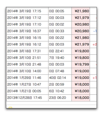 グラフでないので価格推移がでているものを参考にしてみた.12月末から1月末にかけて1.8万円で不動の価格だったのに,3月後半の3連休前に2.2万円にまで上がっている...