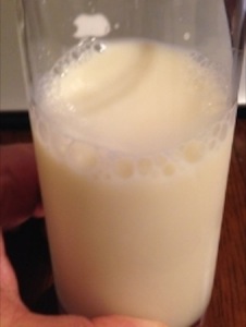一応,念のために色を確認する為にコップに移してみた.豆乳だけに白.でも少し茶色の色素が途中から混ざって来た.もしかして飲む前に振った方が良いのかもしれない.
