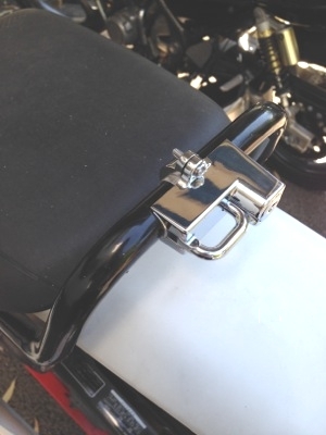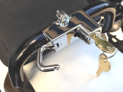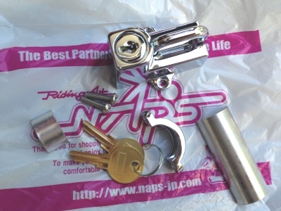 もう一つ買ったのはヘルメットロック.バイクを離れる時にヘルメットを持ち歩かなくてよい様にヘルメットをつけるわけですが,FTRには1つしか無いので,2つ目を増設しました.
