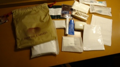 サンライズの袋には,タオル,石けん,カミソリ,スキンクリーム,シャンプー&リンス,ボディソープ,靴磨き等が入っていますが,はっきり言ってタオル以外は全く使う事はありませんでした.シャンプーもボディソープもシャワールームに備え付けのものがありました.(それは別の回で)なのでJRのロゴの入った石けんケースとかも含め,コレクターズアイテム化されちゃうかも...