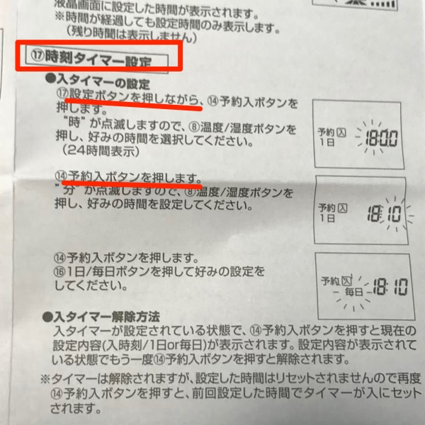 まずは時計設定.「設定」ボタンを押しながら「1日/毎日」切り替えボタンを押します.その操作はリモコンの表面にも記載がある.