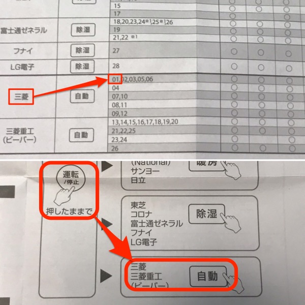 うちのエアコンは霧ヶ峰のMSZ-GV2519-Wで,リモコン形式はRH191ですが,リモコン番号01で合いました.
