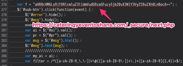 そして添付ファイルのHTMLを見ると,BASE64でエンコードされ難読化されたデータがあった.