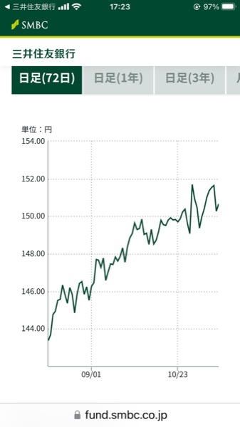 10月5日に1ドル149.58円で50万円分ドルを買い,実際には500,001円で3,342.70ドル分を買えてた.通称には手数料を引かれて円の評価額が495,555円になっていたけど,今日現在のドル→円の三井住友銀行の交換レートは149.65円だそうで,現在は500,235円になるそう.