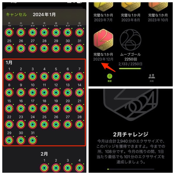 カレンダーから2024年1月を確認しても全てオーバー達成しているのにメダルがもらえない.調べるとAppleのサポートに問い合わせても「よくあること」らしくあまり追求してないようだ.