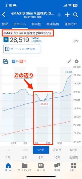これを毎日1000円づつ.そして3月の上旬にあった株価が停滞していたタイミングで,ボーナス払いで10万円とか5万円という単位で投資.チャートを振り返ると,直近では底値だった模様.