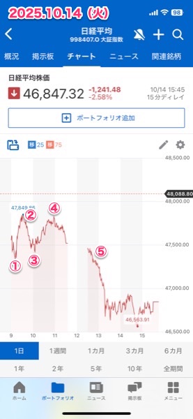 高市自民党総裁が誕生してからギリ連騰していた日経平均が,3連休前の先週金曜日,ジリジリと下がった.
