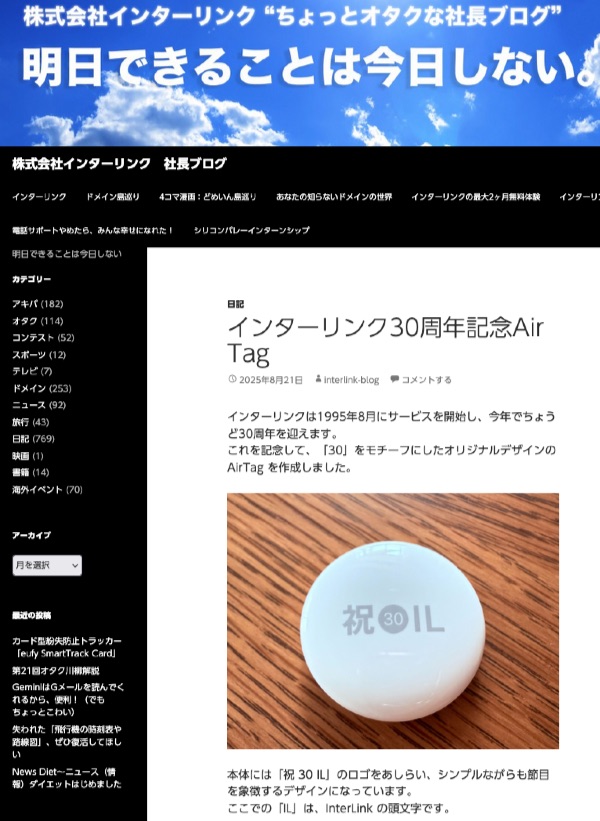 マニア向けプロバイダのインターリンクが30周年記念ということでAirTagのプレゼント企画をやっていたので応募した.