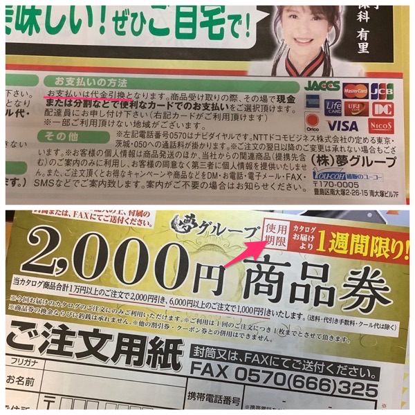 大量の商品チラシとともに,注文書はFAXか郵送で可能なようになっている.そして2000円の割引券がついているけど使用期限一週間.焦らせるのはフィッシングメールのような.