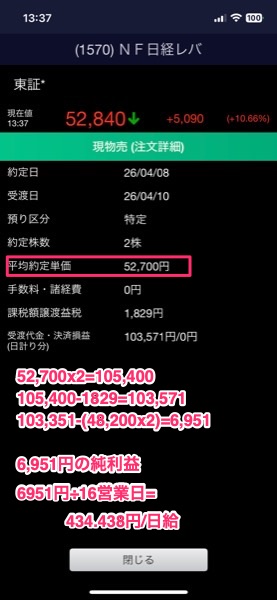 日経平均レバレッジ上場投信 1570 48200円で再入場したのが3月17日.