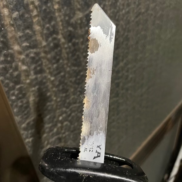 そして使用済みのレシプロソー部分.プリント部分や白いコーティングはハゲてしまったけど,刃こぼれはなさそう.