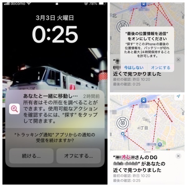 いわゆるストーカー防止機能かとおもい,アラーム機能鳴らしてみたら,私が持ち歩いているポケモンGO Plusに付けておいたダイソーで買ったAirTag互換製品の「紛失防止タグ」が鳴りました.