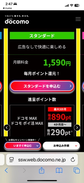 調べたら,うちの場合はドコモ経由で契約するとポイント還元とかのメリットがありそうだったので選んだのだけど,月額1980円で運用してるirumo回線なのでポイント還元も無いに等しいし,「爆アゲ セレクション」なるポイント還元施策にも概と失い.