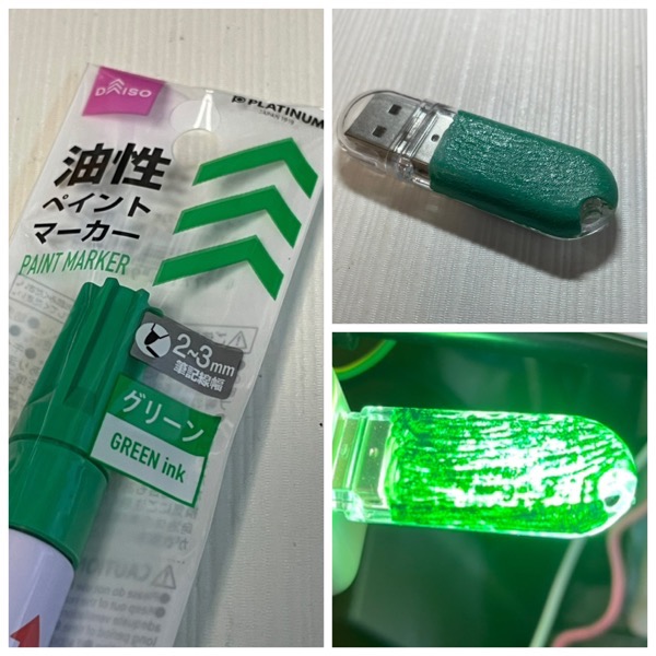 まずは準備として,緑色のペイントマーカーで塗ったものを光らせてみた.