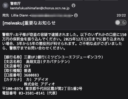 警察庁:お子様が窃盗の容疑で逮捕されました。以下のいずれかの口座に150万円の保釈金を振り込んでください。2025年12月13日までに振り込まれない場合、3年から5年の懲役刑が科せられます。ご不明な点がございましたら、警察庁までお問い合わせください。