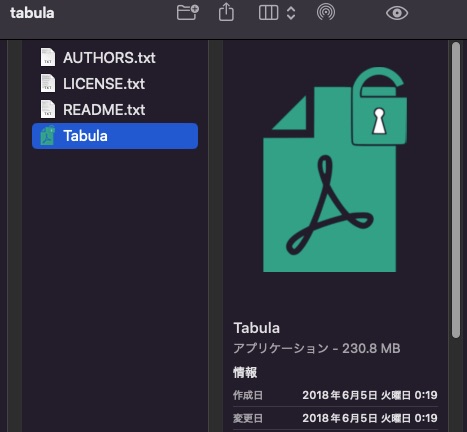TabulaはWindows,macOS,Linuxに対応してるが要するにJavaアプリ.macOS版をダウンロードしてZIPファイルを展開したのがこれ.