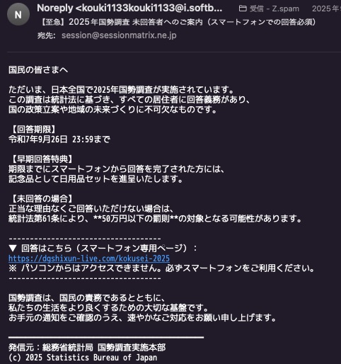 こんなメールが来た.うちのスパムフィルタは鍛えているので,Junkフラグが立たないことは減ってきたけど,それでもちょっと抜けてくる.