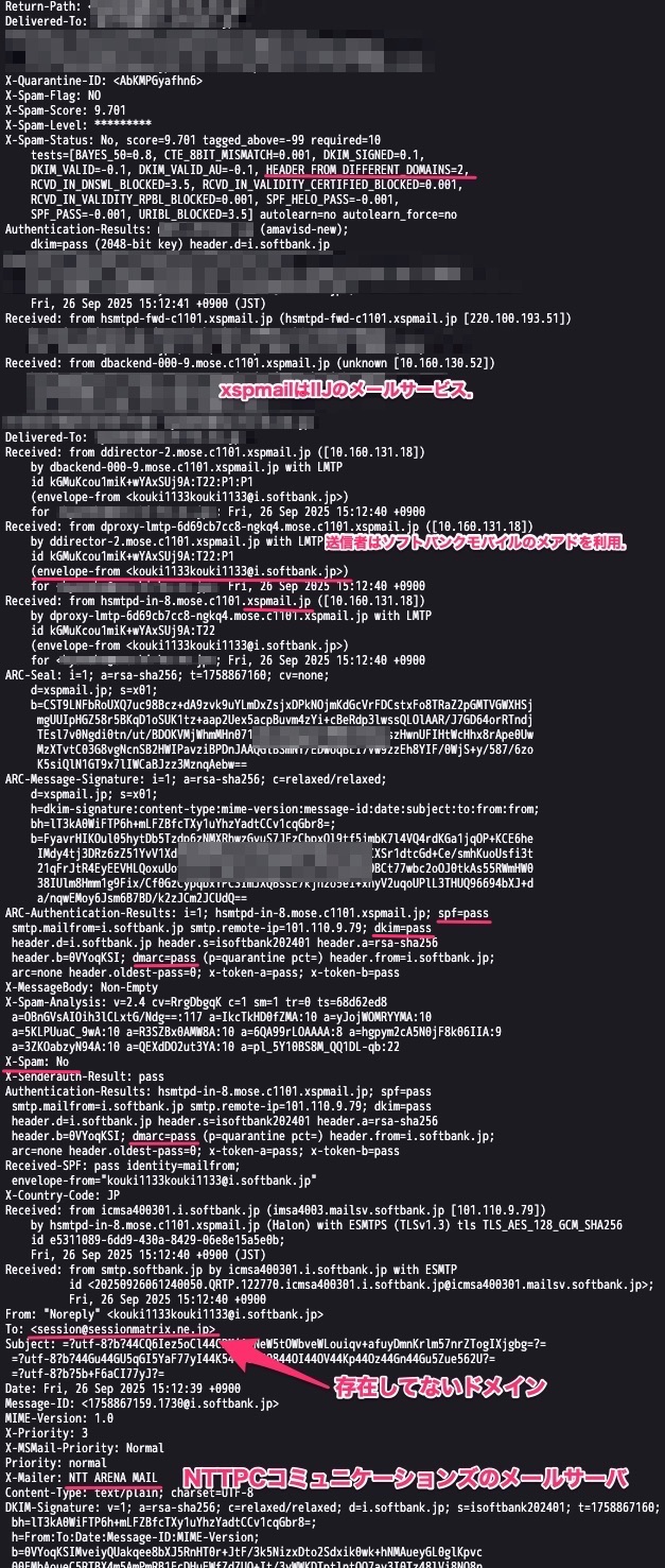 まず,メールのヘッダを確認して,スパム判定されなかった理由を考えてみる.