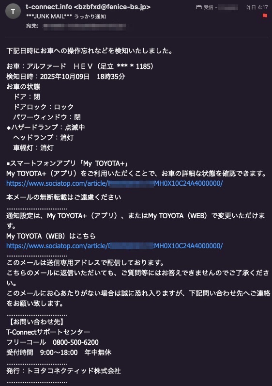 アルファードのオーナーを狙っているフィッシングメールの模様.アルファードは,よくヤードに連れていかれるやつだと思うけど,クルマを盗んじゃおうというフィッシングメールの模様.