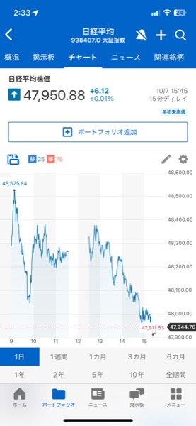 高市自民党総裁が誕生してからギリ連騰していた日経平均が,3連休前の先週金曜日,ジリジリと下がった.