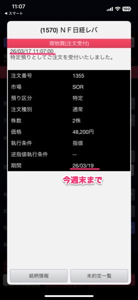 2倍の値動きをするレバレッジ商品なので高値づかみは嫌なので,ちょっと下に基準を置いて指値.