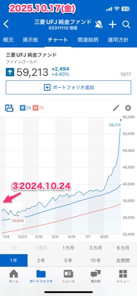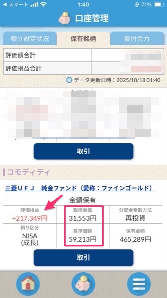 新NISAの残りの枠の関係で,2つのゴールド商品に分けたのだけど,まずは「三菱UFJ 純金ファンド」の結果.