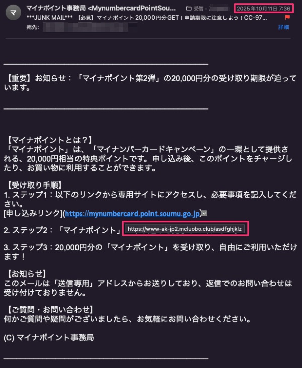 【必見】マイナポイント20,000円分GET!申請期限に注意しよう! というフィッシングメール