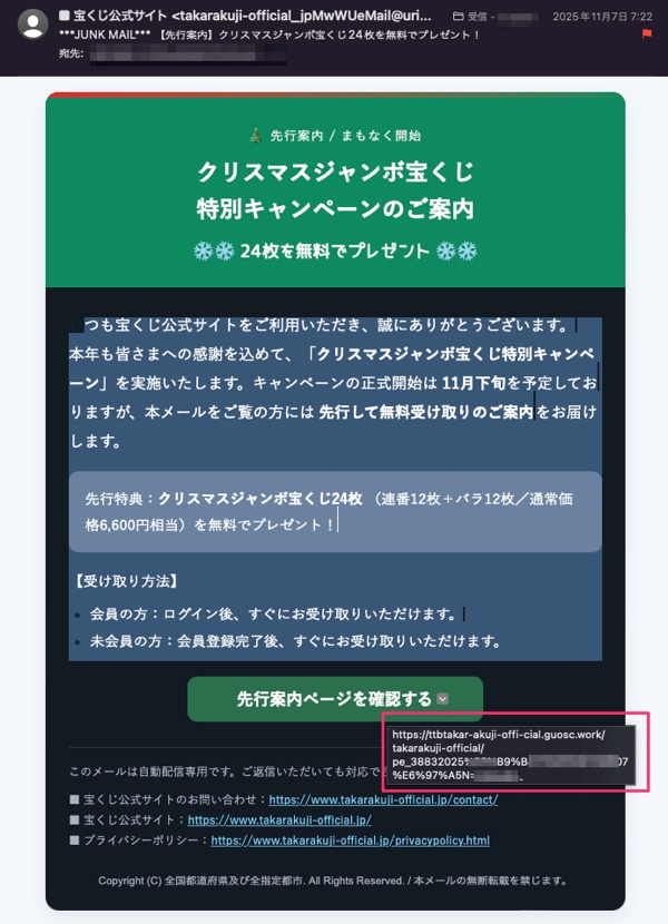 <重要>ごっつあん祭2025キャンペーン 2等当選のご案内 というフィッシングメール
